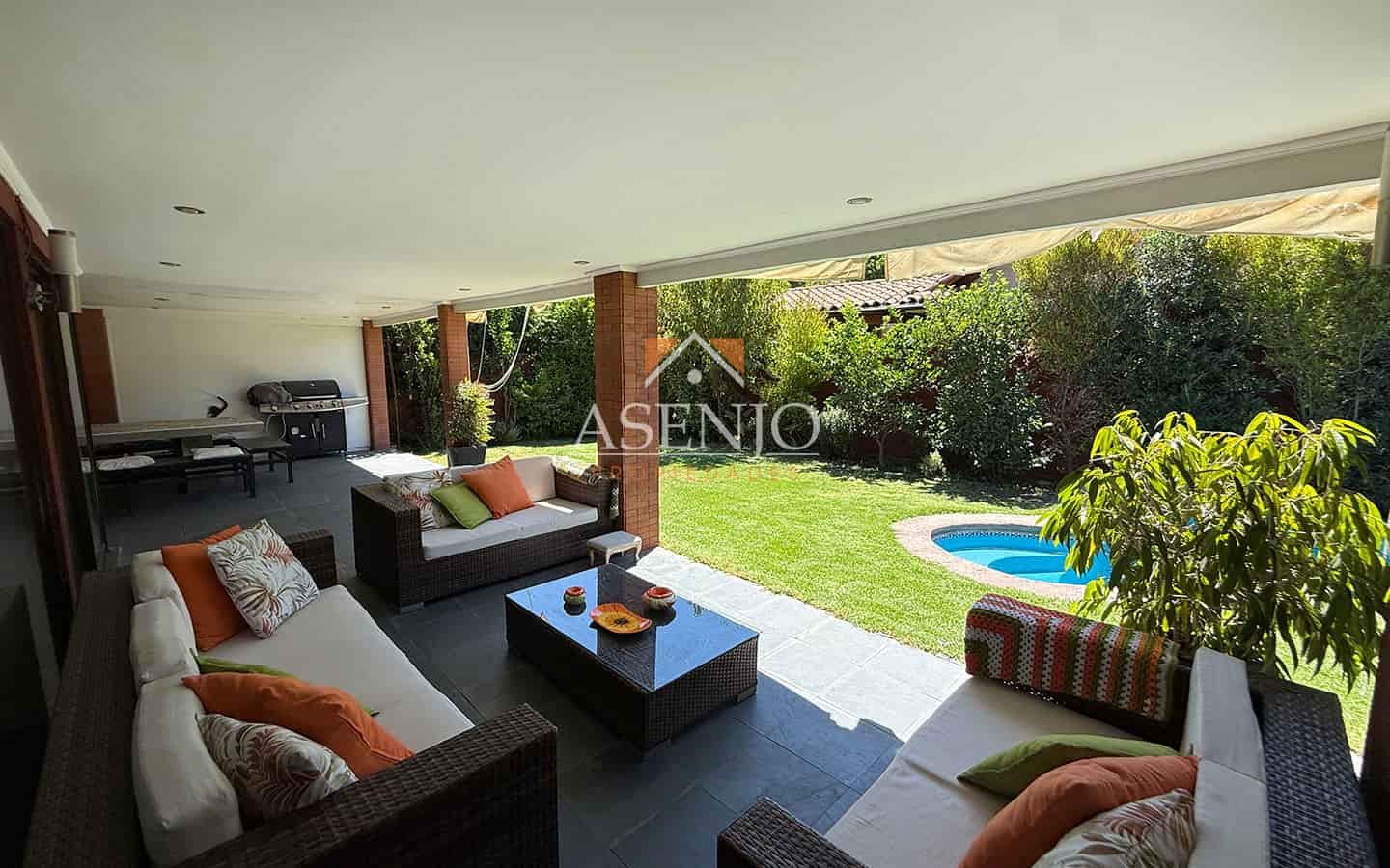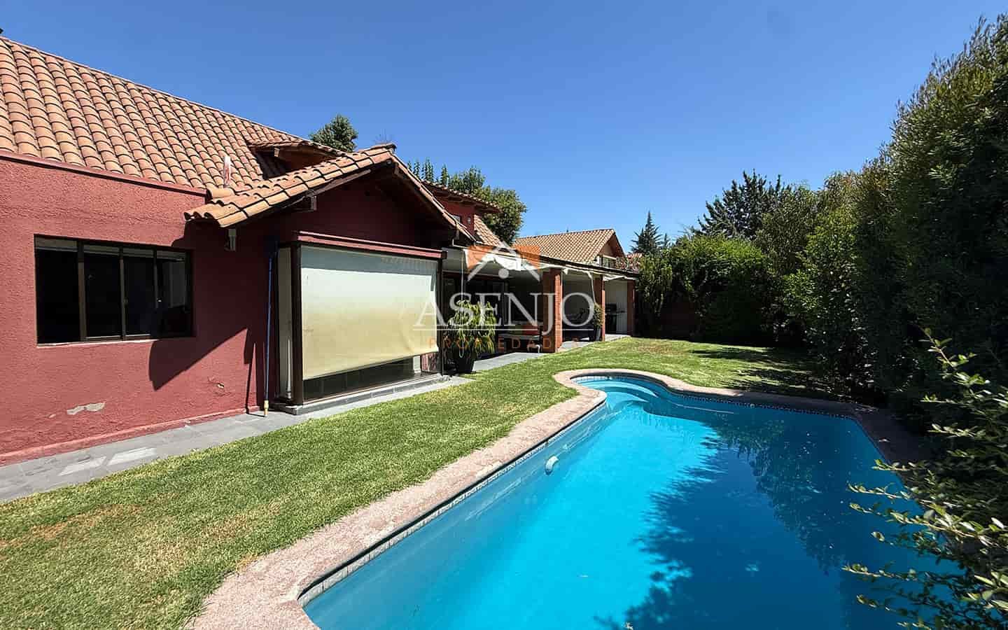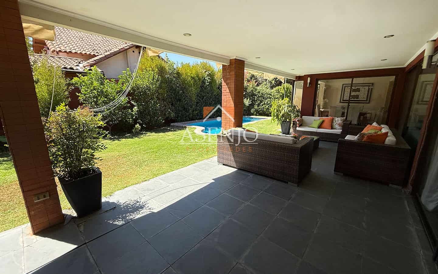 Exterior: Hermosa terraza con pérgola. Piscina de hormigón y jardín consolidado, quincho Estacionamiento para 3 vehículos. Cuenta con Riego automático y 4 aires acondicionados (en dormitorios)