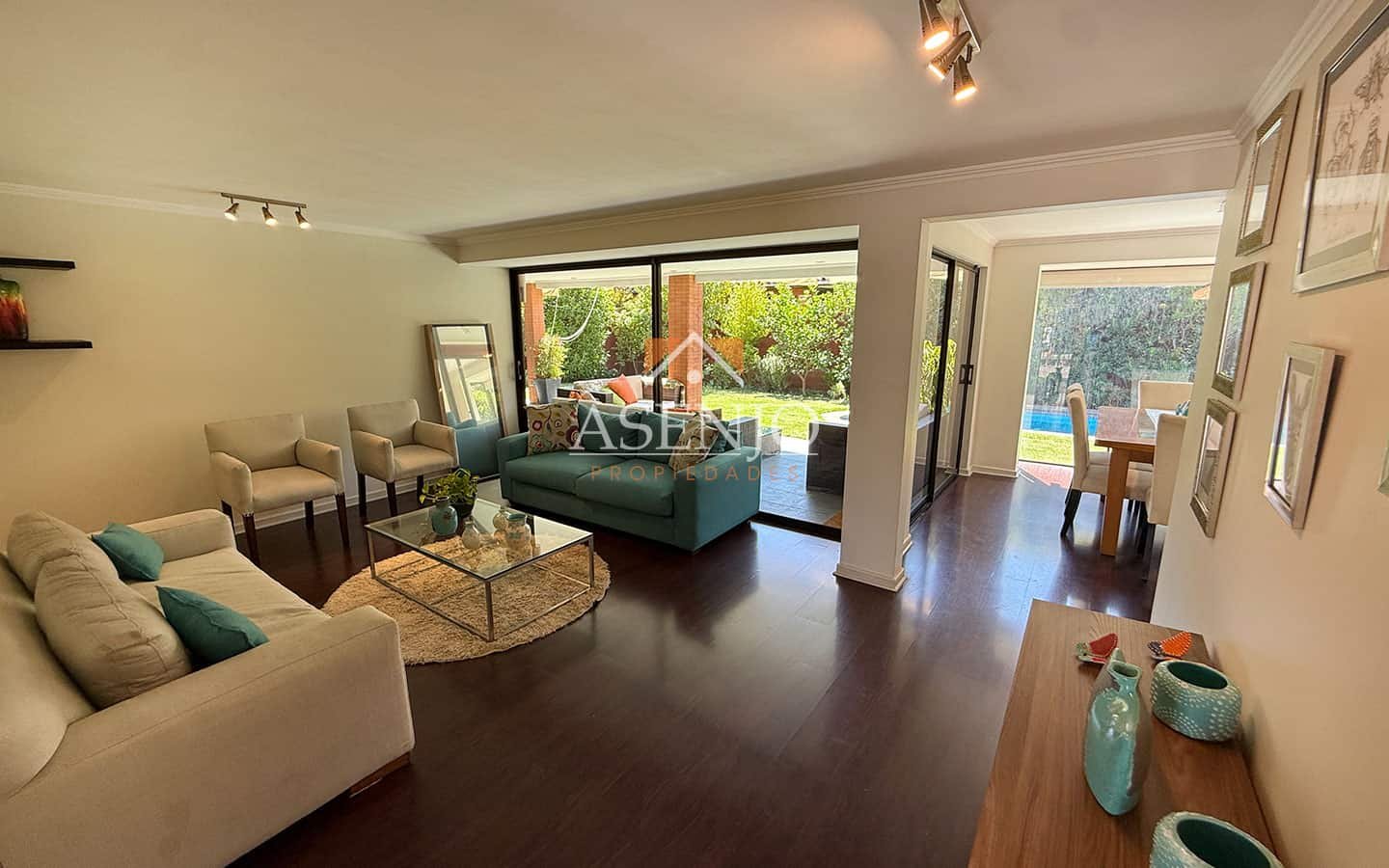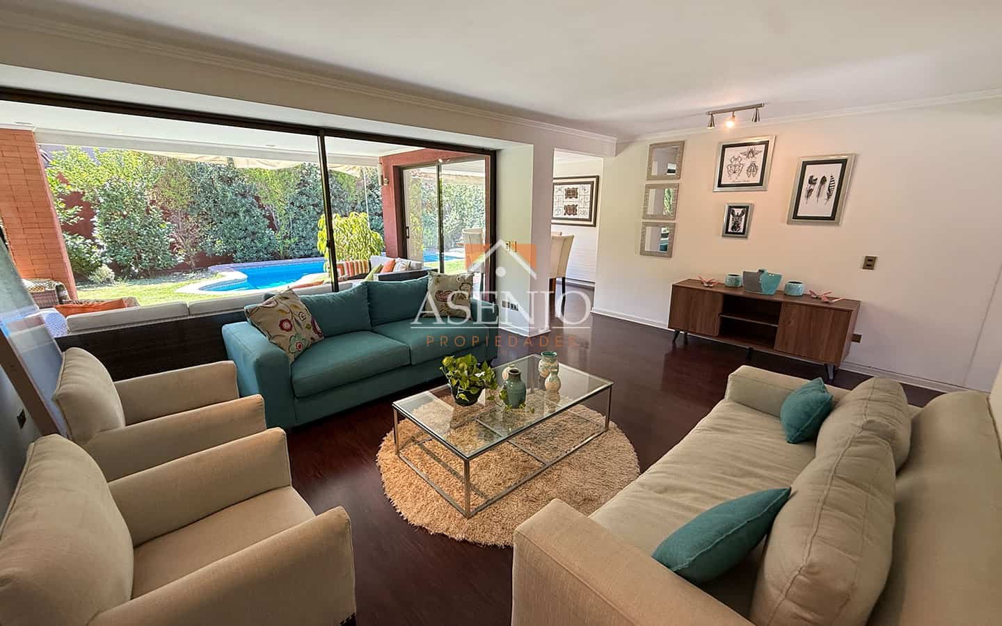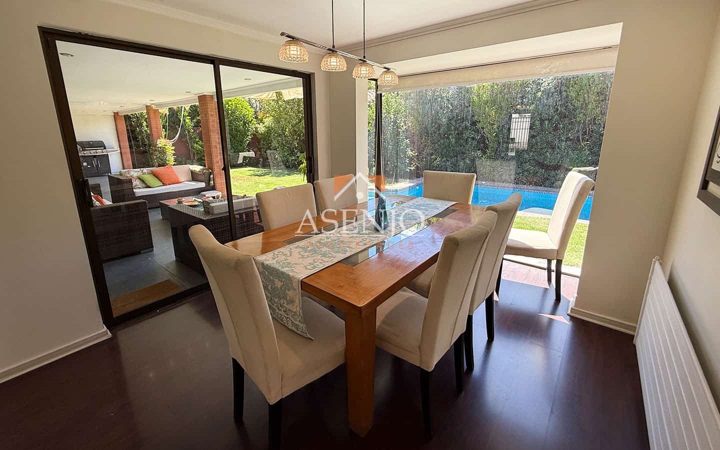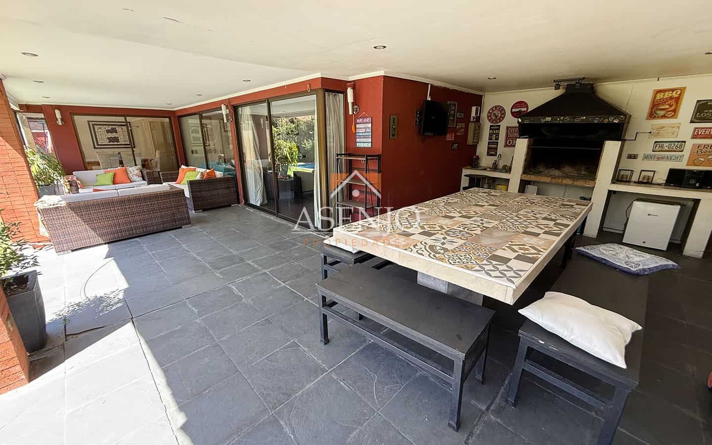 Exterior: Hermosa terraza con pérgola. Piscina de hormigón y jardín consolidado, quincho Estacionamiento para 3 vehículos. Cuenta con Riego automático y 4 aires acondicionados (en dormitorios)